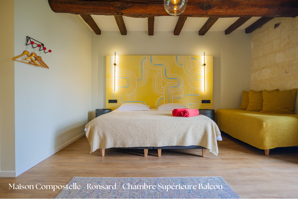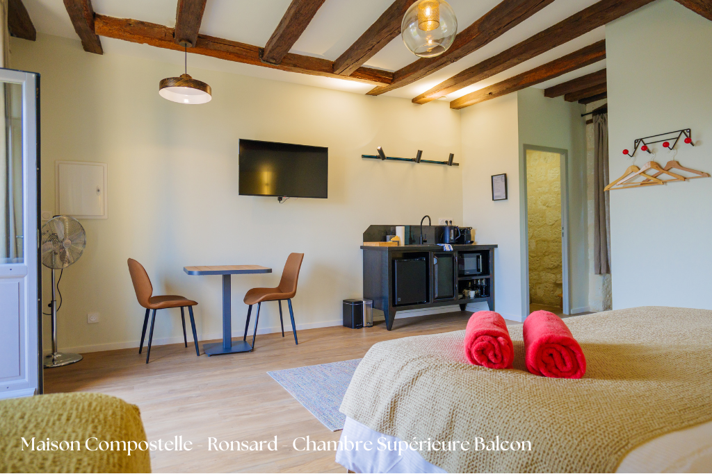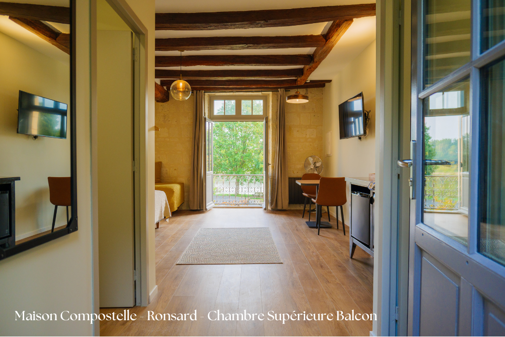 Située à l’étage de la Maison Compostelle, cette chambre confortable (Chambre  Balzac ou Ronsard) vous invite à profiter pleinement du Domaine, à seulement 5 minutes de l’espace Spa. Point de départ idéal pour découvrir le Domaine, le village et la région, elle bénéficie d’un balcon avec vue sur la Loire ainsi que d’une entrée indépendante en rez-de-jardin.