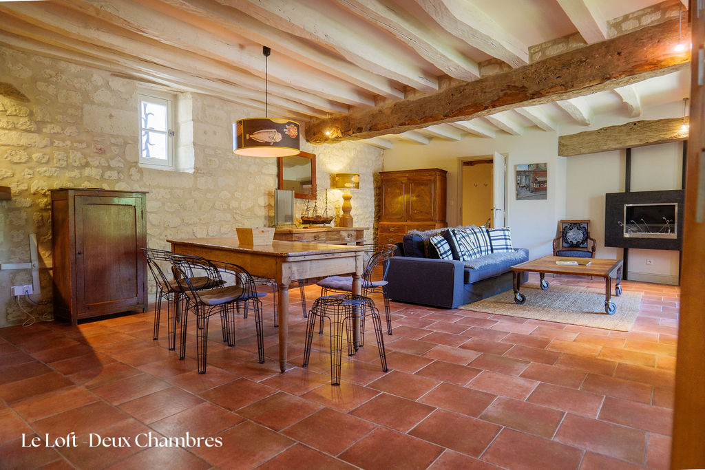 - Etage 1 : Grand séjour avec cheminée à éthanol / Cuisine équipée et table à manger / Chambre double lit Queen Size avec douche et WC
