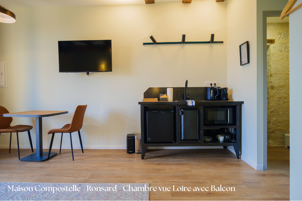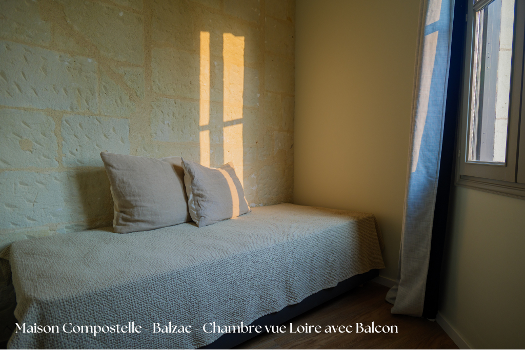 Située à l’étage de la Maison Compostelle, cette chambre confortable (Chambre Balzac ou Ronsard) vous invite à profiter pleinement du Domaine, à seulement 5 minutes de l’espace Spa. Point de départ idéal pour découvrir le Domaine, le village et la région, elle bénéficie d’un balcon avec vue sur la Loire ainsi que d’une entrée indépendante en rez-de-jardin.
